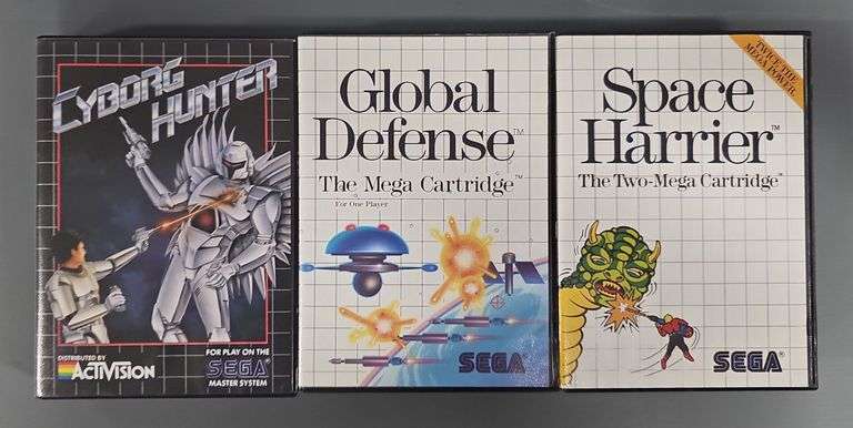 DescriptionSega Master System Cyborg Hunter, Global Defense and Space Harrier, all complete with cases and original instruction booklets.