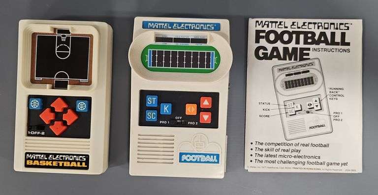 Description1970's Mattel Electronics Handheld Football and Basketball Games with instruction booklet for football. Neither game works, tested with frest 9volt. Both are in cosmetically excellent condition.