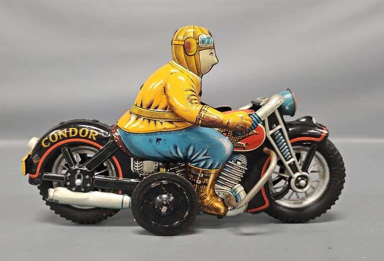 Japanese tin litho friction I. Y. Metal Toys Condor motorcycle toy. Friction-drive, has the original rubber wheels marked I. Y. Metal Toys Japan on the bottom. It is in very good to excellent condition and measures around 12 inches long.