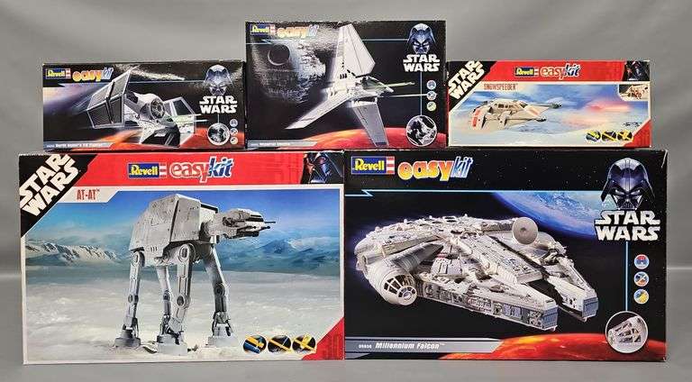Five Revell Star Wars Easy Model Kits to include factory sealed Millennium Falcon 06658 and AT-AT 06662 plus open box, sealed bag Snowspeeder 06661, Darth Vader's TIE Fighter 06655 and Imperial Shuttle 06657.