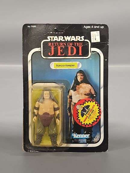 DescriptionKenner Star Wars ROTJ Rancor Keeper on Sealed Blister Card, stock number 71350. The blister is securely attached but there are numerous creases as well as a hole in the card and a slight ding in the top right corner of the blister