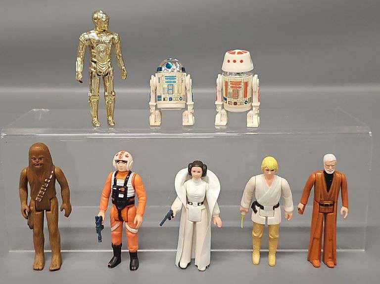 DescriptionGroup of Original Kenner Star Wars Action Figures Good Guys with some weapons. Includes Luke Skywalker farm boy with a nice light saber, Princess Leia with a nice original cape and blaster, Luke X-Wing Pilot with short blaster, R2-D2, R5-D4, C-3PO with a burned hand, Chewbacca in great shape but missing his crossbow and white hair Ben Obi-Wan Kenobi that is missing his cape and light saber.