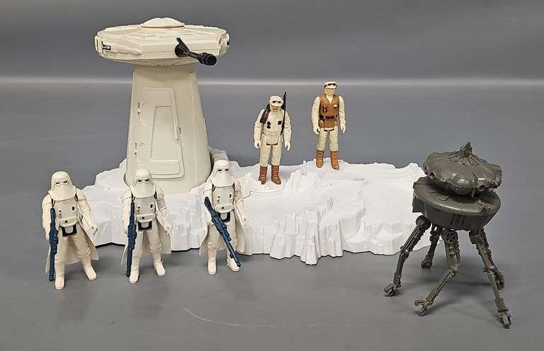 DescriptionKenner Star Wars ESB Hoth Ice Planet Turret with Imperial and Rebel Force, includes Imperial Probe Droid (missing the plastic post that holds it up), Laser Cannon and five action figures to include three Imperial Snowtroopers, Rebel Commander and Rebel Soldier, all in very good to excellent condition with correct weapons.