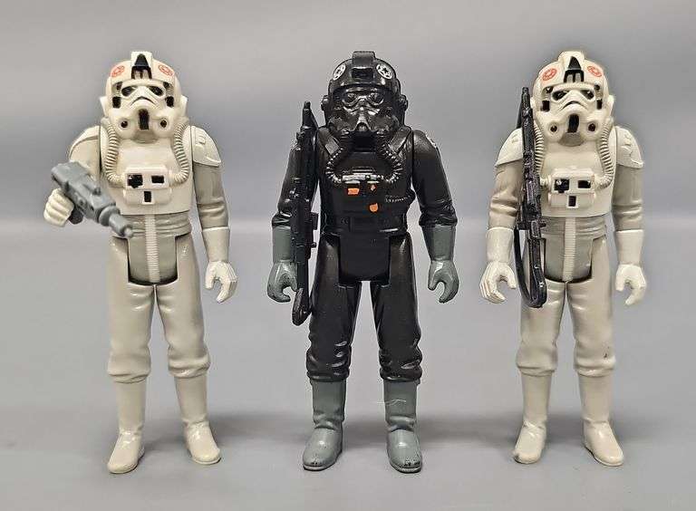 Three Kenner Star Wars Imperial Action Figures, Thomas Industries O gauge two AT-AT drivers and a TIE Fighter Pilot, all in excellent condition with correct weapons.