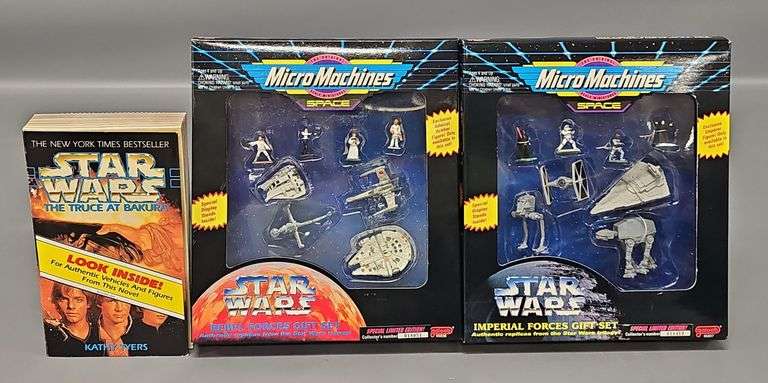 DescriptionGaloob Star Wars Micro Machines Imperial Forces & Rebel Forces Gift Sets and The Truce At Bakura Book. This includes Imperial Forces Gift Set stock number 65837, Rebel Forces Gift Set stock number 65836 with Star Wars The Truce At Bakura die cast set, stock number 66280, all in excellent condition.