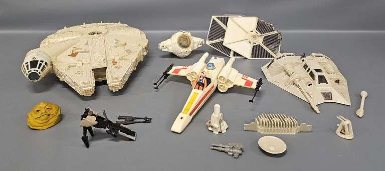 Kenner Star Wars Vehicles for Parts or Repair to include Millennium Falcon, X-Wing Fighter, Snowspeeder, TIE Fighter, Speeder Bike and the top of Jabba the Hutt's head. Sold as-is as seen in the photos with no returns.