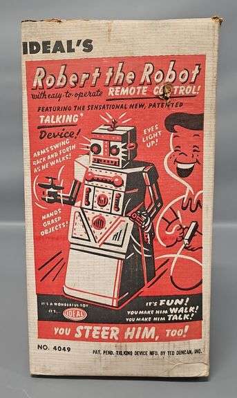 DescriptionVintage Ideal Robert the Robot in Original Box, testes and works but the light inside his head likely needs to be replaced because it was tested with a D cell battery and it did not light up. Comes in a very good original box with a small puncture hole.