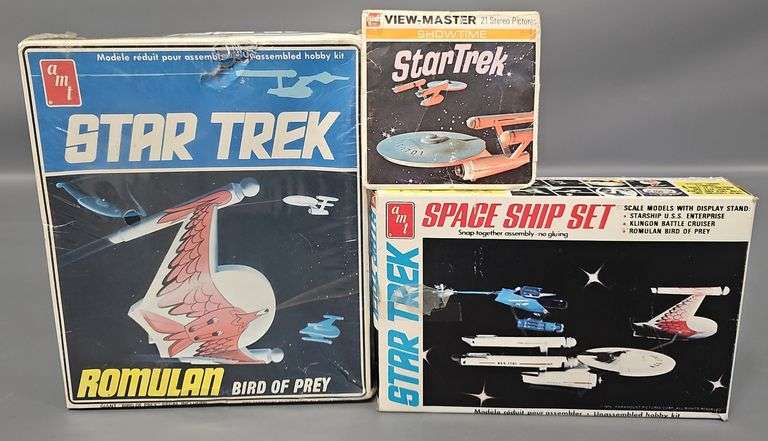 DescriptionGroup of Vintage Star Trek Collectibles to include a factory sealed AMT Star Trek Romulan Bird of Prey, stock number S957, Space Ship Set that includes Romulan Bird of Prey, Starship U.S.S. Enterprise, Klingon Battle Cruiser, stock number S953 and a View Master set in the sleeve with all three discs and correct booklet The model kits are unbuilt and complete. The Viewmaster packet has many tape repairs and the slides have turned sepia.