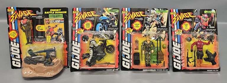 DescriptionFour Hasbro GI Joe Sgt. Savage Action Figures on Sealed Cards to include a Jungle Camo D-Day, Jet-Pac General Blitz with spring-wing jet pack, Urban Attack Dynamite with speed burnin' attack cycle, and Special Edition Cyborg General Blitz! with Enemy Battle Bunker. The blisters are all firmly intact, two of the cards have surface paper loss from the removal of price stickers at the top right corner.