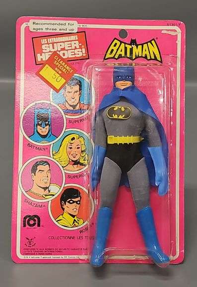 DescriptionRare Mego Canada Batman Les Extraordinaires Super Heroes on Sealed Card, superb condition figure with a slight ding to the top of both sides of the blister, the card is in nice shape with the original price sticker of $1.50 but also has some surface paper missing at the top right corner no creases on the front and a small crease on the back.
