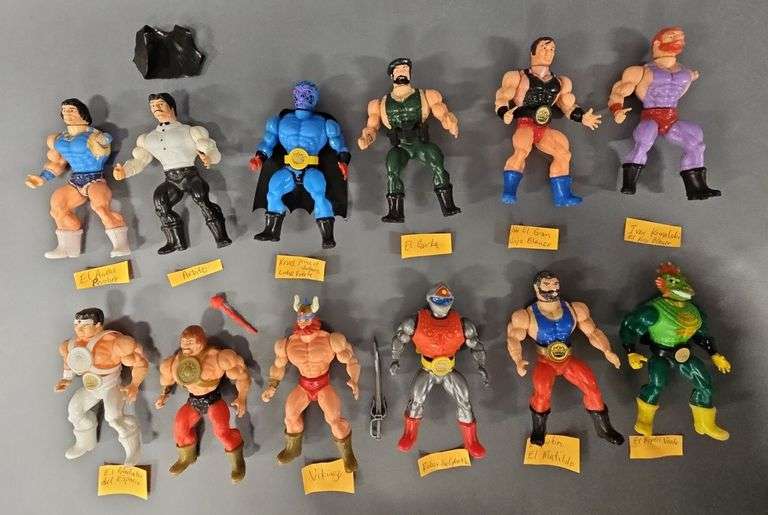 Twelve Guerros Del Espacio Bootleg MOTU KO Knockoff Galaxy Warriors Space Fighters, some are incomplete, some are complete, most show play wear, very hard to find in any condition for the most part. The names of some of the figures includes Arbito, Robox The Cyber Man, Lucha Fuerte (Kruel Prince of Darkness), El Matildo (Rasputin), El Ancho Peuchele (missing an arm and some body paint), Vikingo, El Ruso Blanco (Ivan Kowalski who is missing a left arm with purple legs), Kato El Gran (Ninja Blanco), El Reptil Verde, El Gurka and El Gladiator del Espacio. These are most certainly from Argentina. They came with a good number of the toys that are from between lot 138 and 159. The Eternia set even has a different colored cannon on the top of the castle than the normal US version.