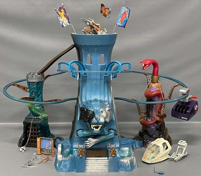 Fantastic Argentina Mattel MOTU Eternia Set Complete and Working. A fantastic set that is complete with no broken parts but does show signs of play wear and it still works great. Color is nice everywhere. The laser blaster cannon that sits on the top of the castle is gray as opposed to red which is a common color for those found in the US. We also have, being sold in lot 139, a great group of knockoff figures that were sold in Argentina.
